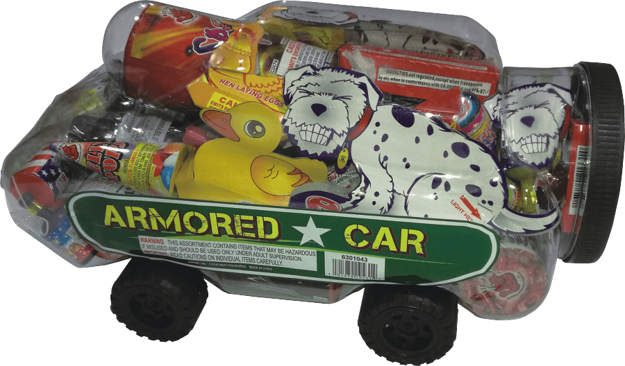 Great packaging ensures the young ones will want this plastic molded armored truck toybox full of firework goodies. Put it on the shelf and watch the young ones drag mom and dad to get it and all the goodies inside.