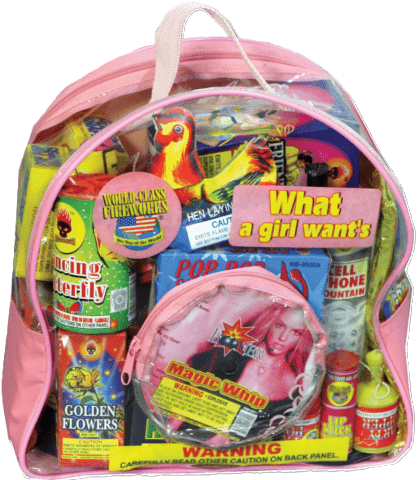 Appropriately priced and packed with hours of fun. And, on top of it all, when the fireworks are gone there is still a pink backpack left to fill with all her little goodies. This bag comes with all her favorites, a lipstick fountain, a cell phone fountain, chickens, pop pop snappers, confetti throwers and more. She’s gonna love it, no doubt.
